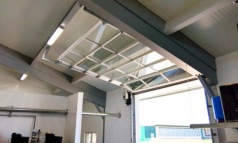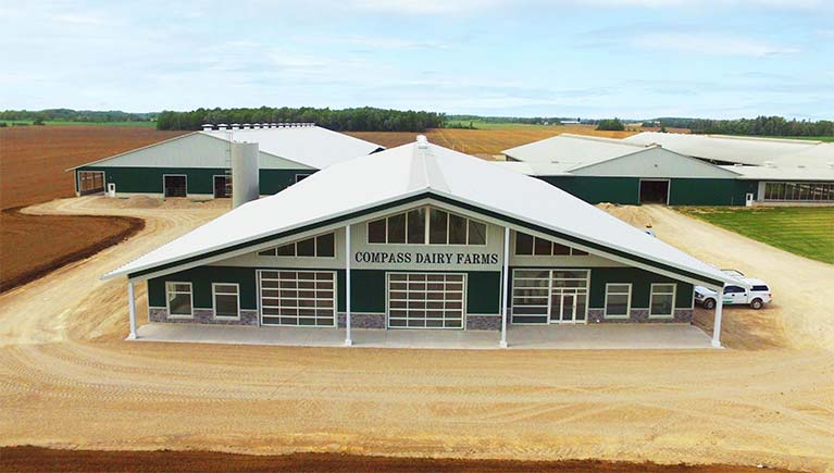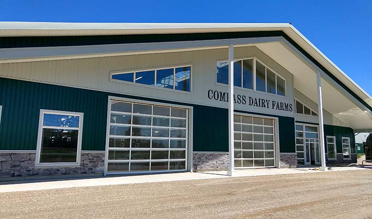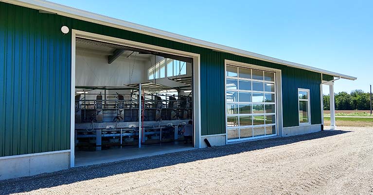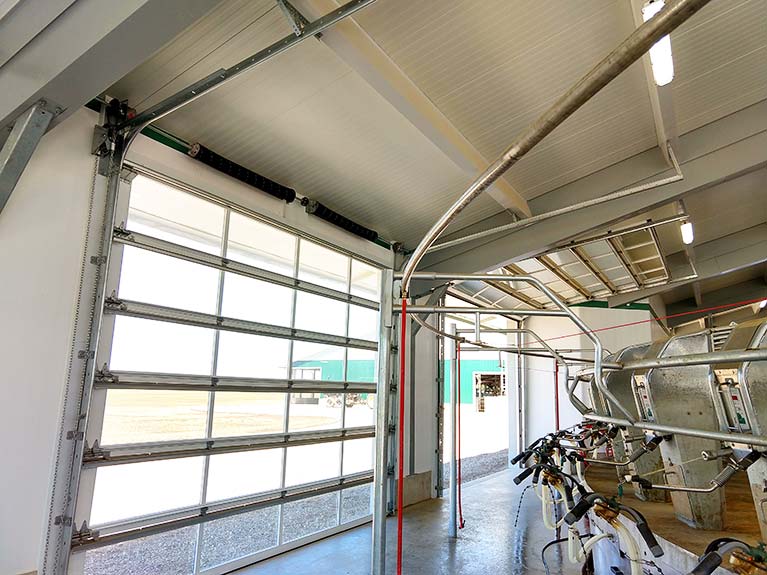 The rotary milking parlor features commercial full-view overhead doors with glass window sections and white powder coated frames, offering a see-trough design solution that complements both the exterior color scheme and allows for light to pass through to the interior. These full-view overhead doors are operated manually by chain hoist.