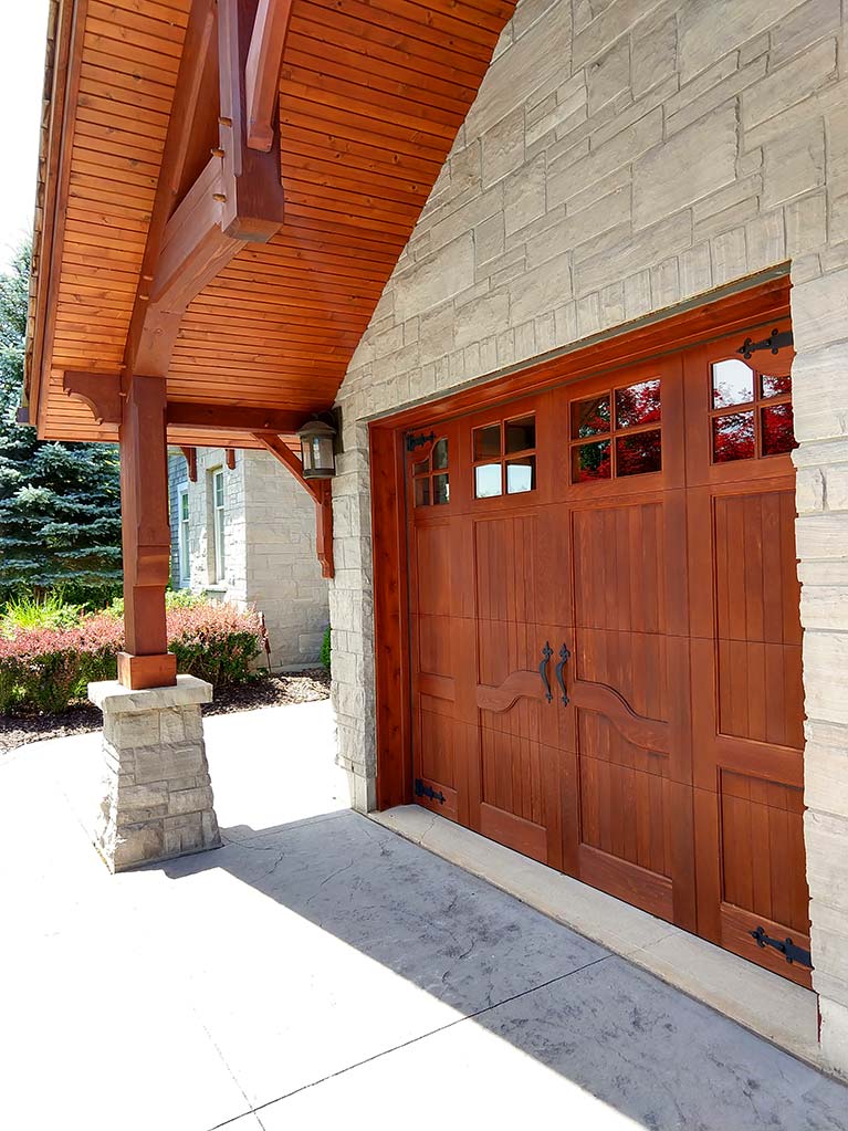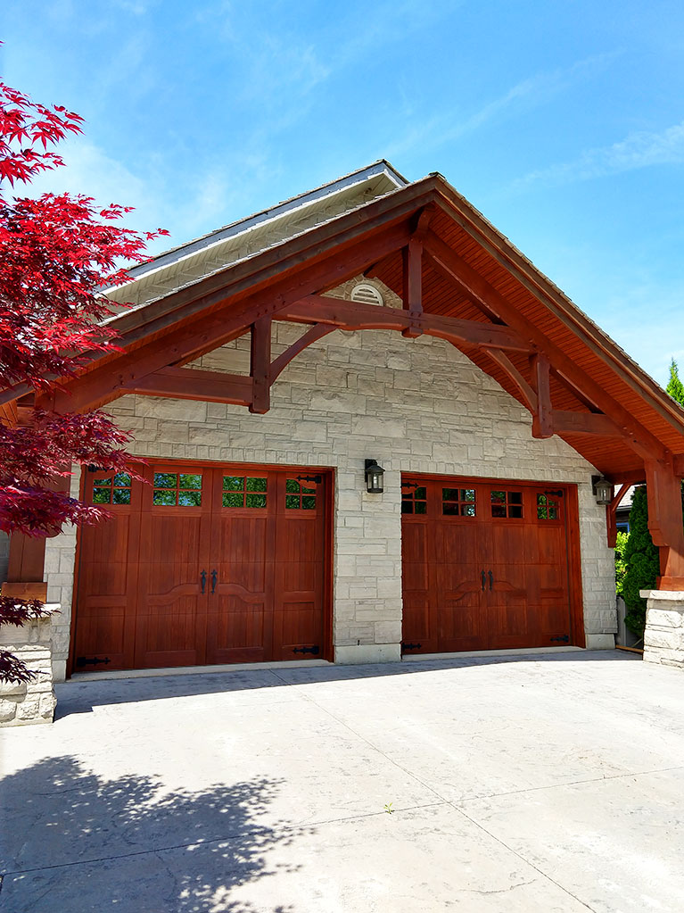 Twin Harrington Design garage doors with maple wood finish offer a stylish look and match the exterior and overall color scheme of the building. The wooden garage doors are Canadian made by Oxford Carriage.