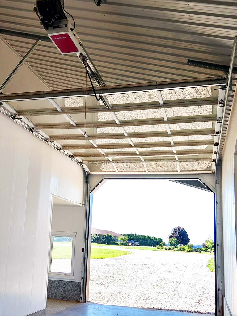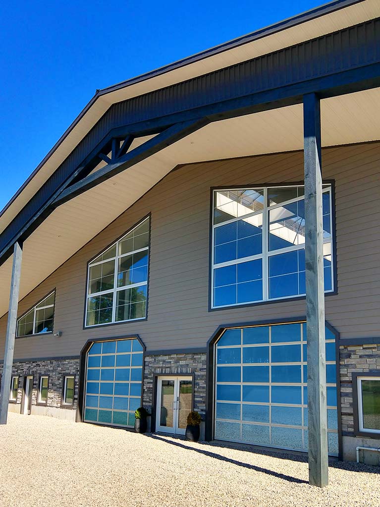 The insulated glass panels offer a see-trough design solution complementing the exterior color scheme and allowing for light to pass through to the interior. The side overhead doors are operated by LiftMaster electric openers and the middle doors by manual chain hoist.