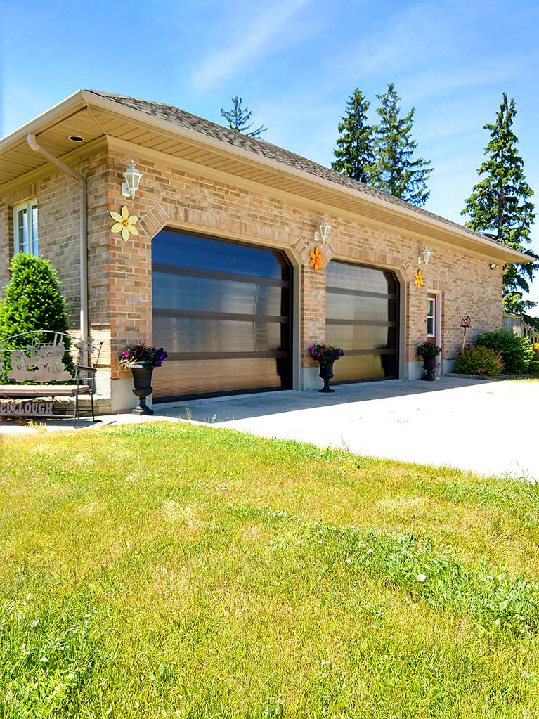 These dark polycarbonate garage doors offer a see-through design solution for the garage, matching the exterior and color scheme of the building.