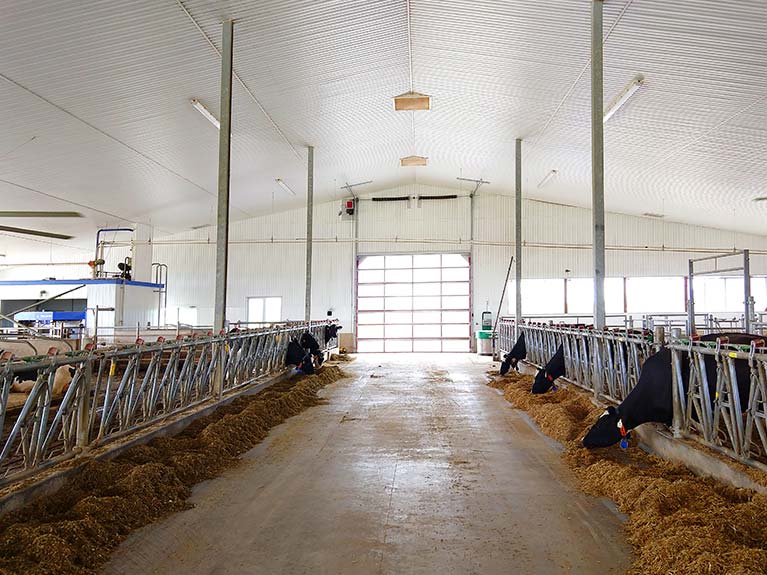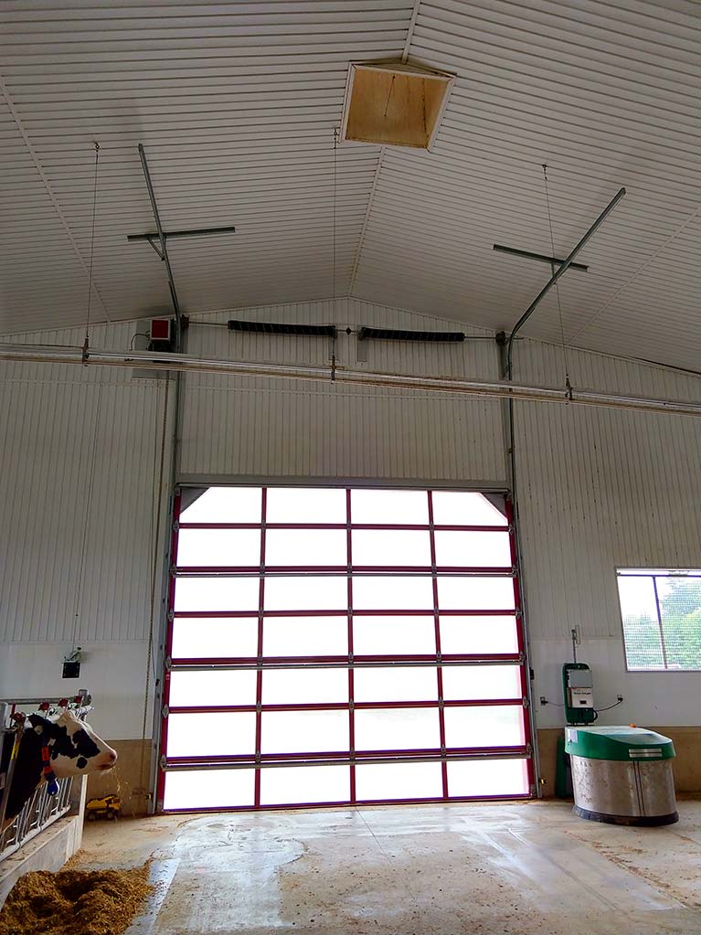 Easy Lift Doors installed these 16′ x 14′ polycarbonate overhead doors with red powder coated frames and 18′ x 13′ and 10’ x 9’commercial overhead doors at a farm in New Hamburg.